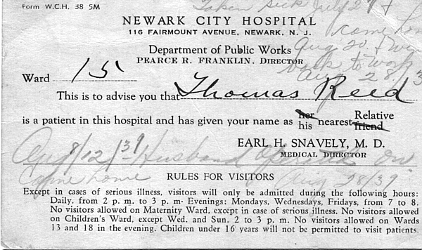 This postcard was found which may correspond to that surgery. In those days a postcard was sent to a patient's next of kin to inform them of any hospitalizations. Phones were not prevalent in everyone's homes like they are today.