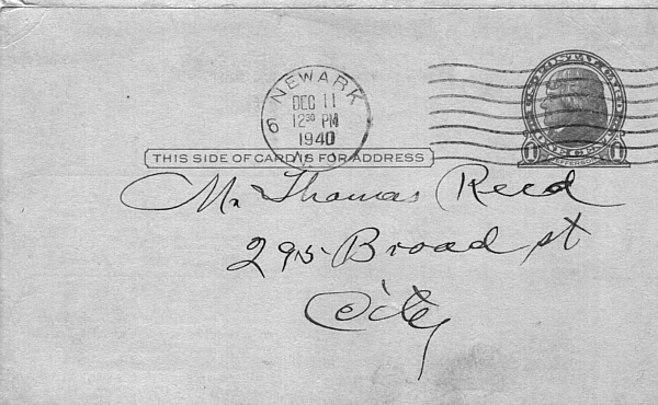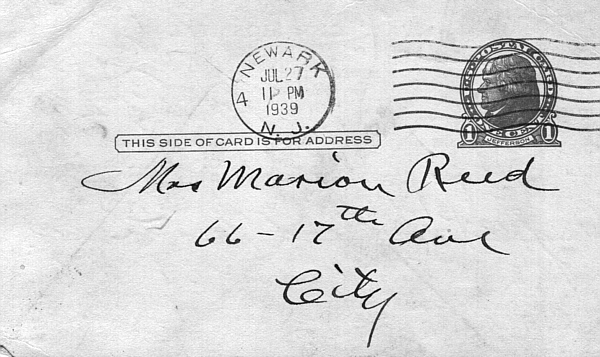 The card is postmarked from Newark on July 27,1939. The notes in the margin : "Taken sick July 27 & came home Aug 20 & went back to work Aug 28/39." On the line is written "Aug 8/12/39- Husband operated on. came home Aug 28/39"