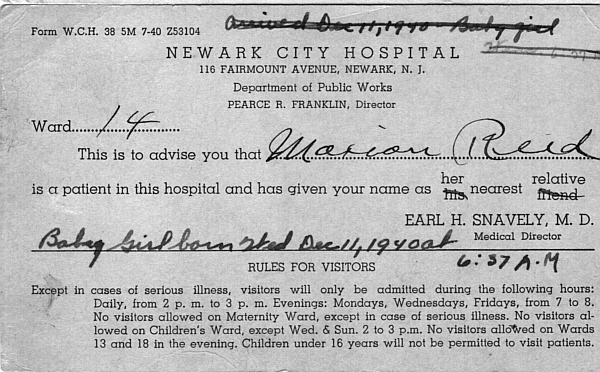 A third postcard was found that may or may not be connected to the one in July. It revealed the tragic birth of Thomas and Marie's first child, a still born baby girl. She was born on December 11, 1940 at 6:37A.M. My grandmother, Marie, was told that she would not be able to bear any other children.