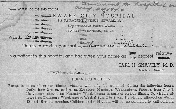 Other than a brief note: "Tom went to hospital on Aug 24,1940" there is no other information to give us the reason he was there. "Marion" was written on the line, but that might have been just a notation of next of kin.