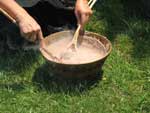 contained a section on Native American basketry. One group from California demonstrated preparing acorn mush in an antique basket. Acorn mush is made from black acorn flour and water. Soapstones were heated and transfered by two poles acting as tongs. After being quickly dumped in water to clean off the ash, the rock was lowered into the acorn mixture and constantly moved on the stick stirrers so not to burn the basket. A new rock replaced the old until the mixture thickened.