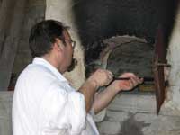 Tom Martin conducts his advanced hearth cooking workshop over the President's weekend in addition to one held during the summer. Everyone attending, from hearth cook instructors to people who have been hearth cooking for years, benefited from Tom's teaching. As seen in the pictures of the Sunday dinner, a great variety of food was prepared in his bake oven and hearth. This year's theme concentrated on preserving in a variety of ways and then using the dried or pickled foods. We made so many foods I can name only a few: Schnitz & Knepp, Salisfy Soup, Turkey & homemade sauercraut, Stuffed stomach, Split Pea Soup, Breads and rolls, Mush muffins, Faschtnachts, Mrs. Leslie's Chocolate Cake, Potatoe Pie, Marlborough Pudding, Lemon Ice Cream and several types of pumpkin pies. We were able to use the salisfy and horseradish direct from his garden on a mild February day.