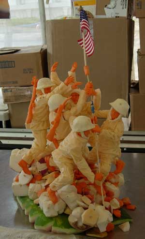 Iwo Jima Monument out of vegetables on a watermelon rind base.