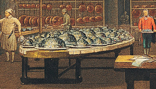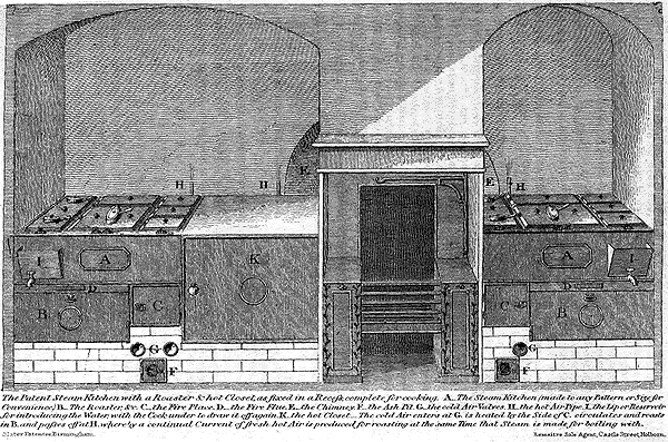Slater's Steam Kitchen, 1812 was one of many styles of cooking apparatus using steam to prepare food. The upper container 'A' held water which was heated by a fire box 'C' with its ashes falling below. Tin square 'kettles' were submerged in the hot water and steam, with their rims flush to the iron top. More details are given with the image.