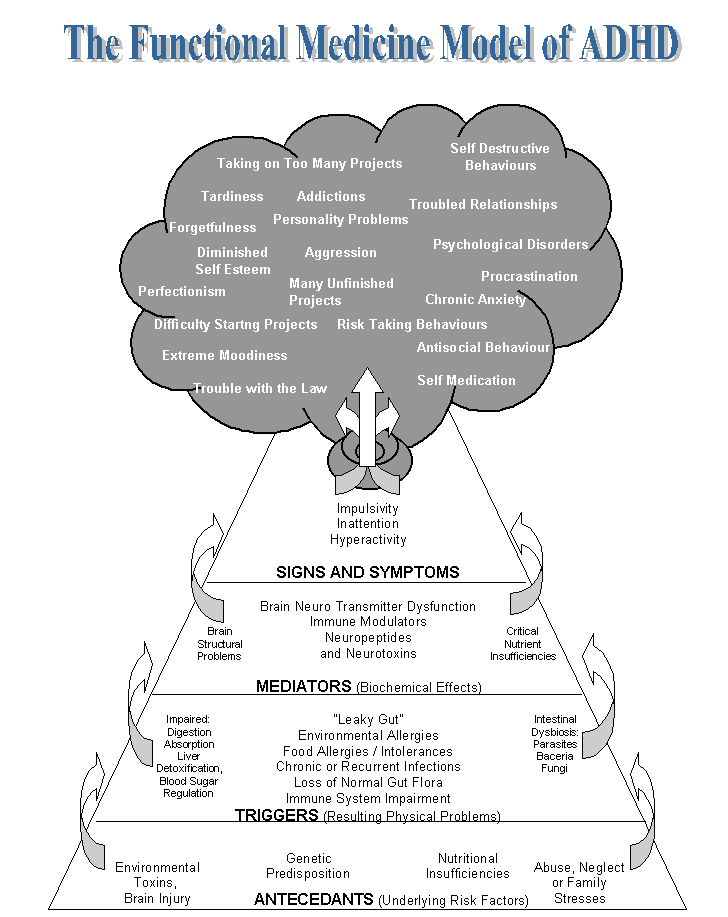 ADHD and its comorbidities are lifelong disabilities and will require adequate and effective ongoing multi-modal management and support. The management of ADHD must target both the ADHD and the comorbidities. A biopsychosocial approach such as the functional medicine model provides maximum benefit and no harm. When the principles of functional medicine are properly applied a wide array of the above mentioned symptoms may all improve or completely resolve. Functional medicine seeks to correct and resolve the underlying factors that have led to the symptoms in the first place. As Michael Lyons puts it ….. "the most important key in the management of ADHD lies not in the masking of symptoms, but rather in systematically uncovering and treating the underlying medical problems which are the heart of the this disorder" (p 50, Healing the Hyperactive Brain).