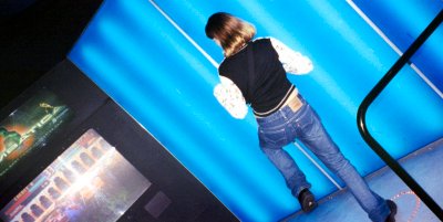 Me and Hay getting strapped into the Rollar Coaster Simulator. ^_^