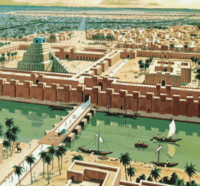 Acima, reconstrução do Caminho das Procissões com o Portal de Ishtar (centro) À esquerda, o zigurate mais importante da Babilônia, o Etemananki, dedicado a Marduk, o Deus supremo da Cidade