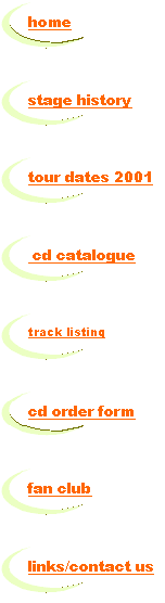home | stage history | tour dates 2001 | cd catalogue | track listing | cd order form | fan club | links/contact us |