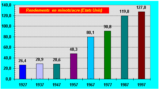 Par comparaison, au Canada, les rendements moyens de maïs en 1997 furent de 109.5 minots à l'acre (6870 kg/ha).