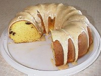 Put all ingredients for cake in a large bowl and beat 2-3 minutes. Oranges will break up nicely. Add the raisons to batter. Pour into a greased bundt cake pan and bake at 350* for about 30 minutes, or until it springs back when lightly touched. Cool completely.