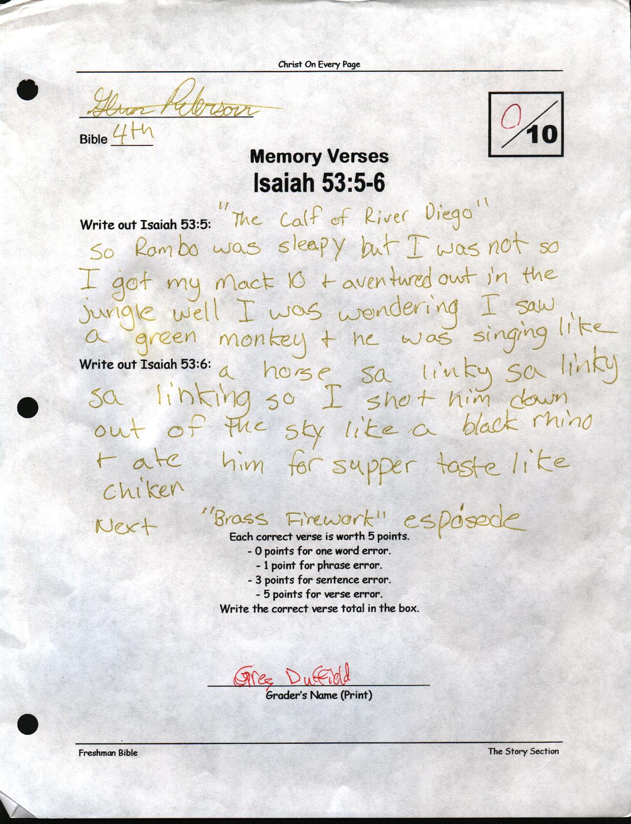 Glenn wrote all these stories in Bible class. I am the character Rambo. They are all real great. Email Glenn here.