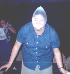 Jenny is in the Gym during ‘Midnight Madness’ Her goal is to spit out chewed up bananna in a cup through a pair of pantyhose that is over her head….Doesn’t look like it worked!