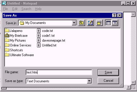 Create your page in notepad and save it by clicking FILE - SAVE AS at the top of the notepad program.