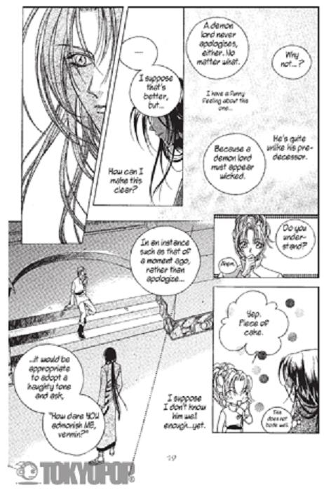 He finds Raenef V. Raenef is a cute, innocent, kind, and noble being. And so begins the challenge of shaping him into proper demon lord material. This is a tale of humor and mystery as Raenef tries his hardest to be a kind noble person and a wickedly harsh demon lord at the same time. As he studies, Eclipse slowly gives up trying to change his personality. Later on, however, he begans to appreciate his kindness. As Raenef trains and studies, he somehow always finds a way to embarrass him. For example in a demon lord meeting, Raenef enters and says something pleasant and all of the other demon lords make fun of him. He remembers Eclipses' lessons and he says to all the mighty powerful demon lords, "How dare you admonish me vermin?" I personally found that very funny. Raenef also is attacked by a female knight, Erutis, who wants to defeat the demon. Raenef doesn't want to fight, but instead wants to be friends. Later on though Eclipse captures her and she decides to pledge loyalty to Raenef to save her life. Another incident involving a young priest of the high temple of the god Rased, Chris, ends up in peace as well. The young warrior priest tries to defeat Raenef, but manages instead to get beaten by a puny technique (Dark Arrow). The high priest of the temple then sentences Chris to serve in Raenef's castle to learn humility. As the story progresses, many demon lords are introduced. Some friends, others rivals. The demon world is full of deception, treachery, and ambition (similar to ancient Rome). A very entertaining tale to say the least. I believe that everyone should read this manga. It is extremely funny and very amusing. There are only seven volumes in the series. Each run at about $ 9.99. It is definetly worth it. If you don't want to pay, just go to your local bookstore and read it for free.