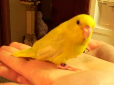 She's our little cutie. She is a yellow parrotlet that is very special because she has a stubby toe because her father bit it off, because he's mean like that.