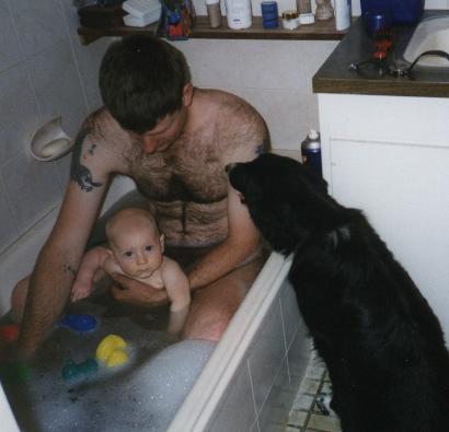 Here is Tristan and his Daddy, and one of our dogs. Bathtime really was a family affair in our house.