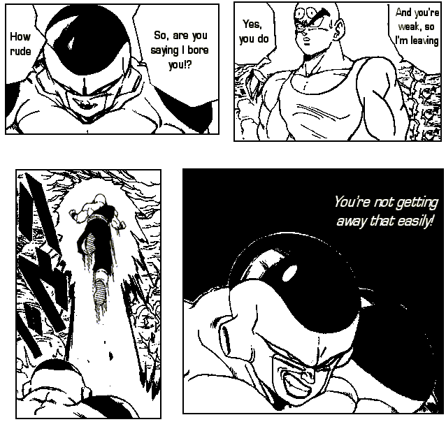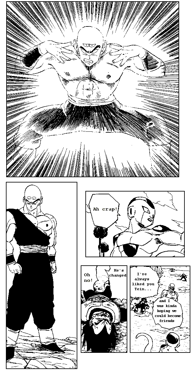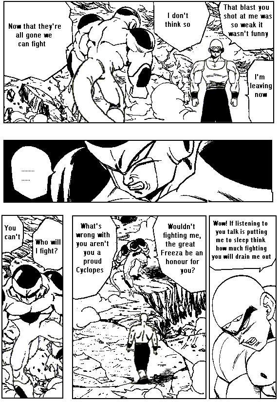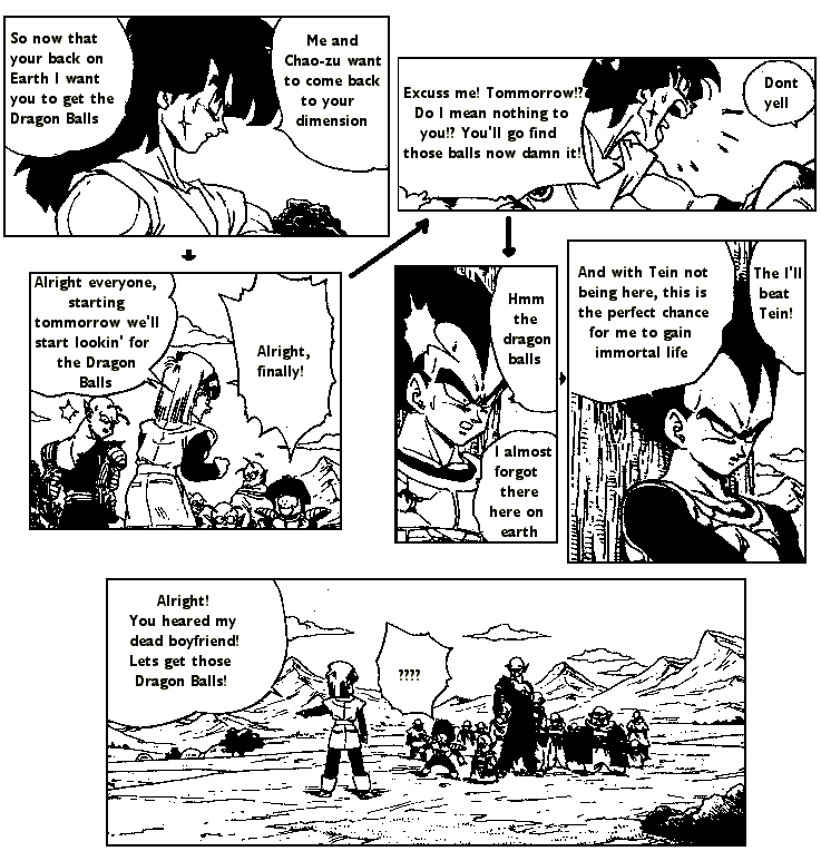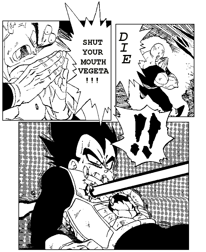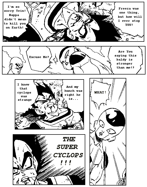 Here are comics that were edited by fanz not by me but by another. I don't, won't, or never will take any type of credit for these Fan Magna comics. I can't say for sure who made them but the site I got them from is DBZ 3:16. You can check their credit on my Credits page This site is no longer being updated and its content is being ignored. So I thought I'de show it off cuz they have a good sense of imagination. Again these were not created by me or Super Vegeta.