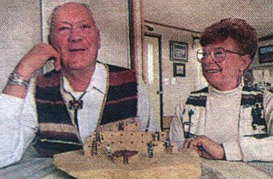 | Rollie, with his second wife Shirley, displaying one of his many sandstone sculptured Indian scenes at their home in Canon City. |