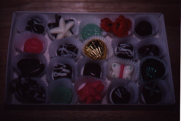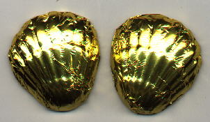 Chocolate scallops are wrapped in beautiful gold foil for an extra enticing treat. A 1 pound box has approximately 35 pieces. Price for foil wrapped 1 lb $24.95, 1/2 lb $12.95, 1/4 lb $7.95. 4 piece pack $1.50 each. Item MG6. Scallops also come unwrapped in any color you choose. 1 lb box $22.95, 1/2 lb box $11.95, or a 1/4 lb box $5.95. Item MG6A. Specify box size.