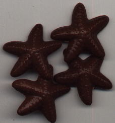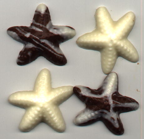 Sanddollars were molded from REAL MAINE sanddollars we bought in a store. 3" x 3" weight 1 1/2 oz. These are nice in white or milk chocolate brushed with white or gold luster dust. 2 per pack. Item SD $2.25.