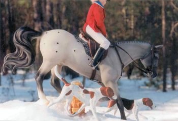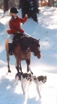 Wap Peacock(MI) Foxhunting Over a fence on the hunt trail accompanied by hounds |  Special Claudit (RH) English bareback at a hand gallop |