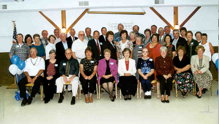 Standing L to R: Richard Richards, Sara Jo Hyatt Lamb, Wanda (Judy) Bourne Smith, Bob Flinn, Glenda Tucker Cattarello, Bill Price, Byron Griffey, Darol Crays, David Terboss Whattler, Don Guthals, Pat Armijo, Perry Hill, Norma Dooley Farin, Bruce Thayer, Christine Marlman Howe, Helen Elmer Morrow, Tom Hulse, Elora May Ferrell Poyner, Louise Hill Hatfield, Emma Duran Perez, Lee Robinson, Bob Tigner, Amy Uyeda Shiozaki, John (Bud) Elder, Ted Lara, Shirley Shenk Gardner, Maureen Kenworthy Wedel, Jennie Schroeder Crays, Dorislee Ferrell Jones.