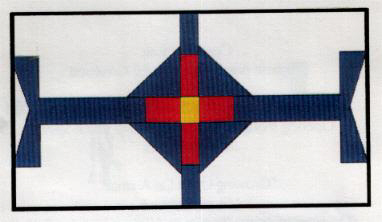 Rollie adopted as his own symbol a Cheyenne beadwork design found on the ceremonial shirt of a Cheyenne brave. The design (above), in red and blue, on a white background, adorned his belt buckle, his bolo tie and the tiles on his kitchen table.