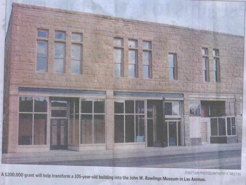 ![]() underwritten by Rawlings' son, Robert H. Rawlings, publisher of The Pueblo Chieftain, who contributed $150,000 in memory of his father. Finau said that Phase 2 will complete work on the front of the building. "All the storefronts will be restored and the construction will proceed to the interior of the first floor," she said. Finau said that phase also will cover electrical, plumbing and heating work. The project also received another $12,000 federal grant for an art gallery on the far south end of the building. Finau said the gallery will showcase the work of local and regional artists. Ensuing phases will include restoration of all windows, all interior and masonry work. Floors throughout the building will be replaced. Funau said the museum will display Bent County historical memorabilia, including the Santa Fe Trail's role in the area, and interpretive displays of prehistoric artifacts found in Southeastern Colorado. Most of the displays that will be featured at the new museum are currently displayed at the Kit Carson Museum on the south side of town. Finau said the new museum's collection will include a bank counter from the early 1900s. Anyone interested in helping with the building restor- ation efforts can contact Finau at (719) 456-0452. Finau said cash donations as well as important artifacts from the region will be appreciated. |