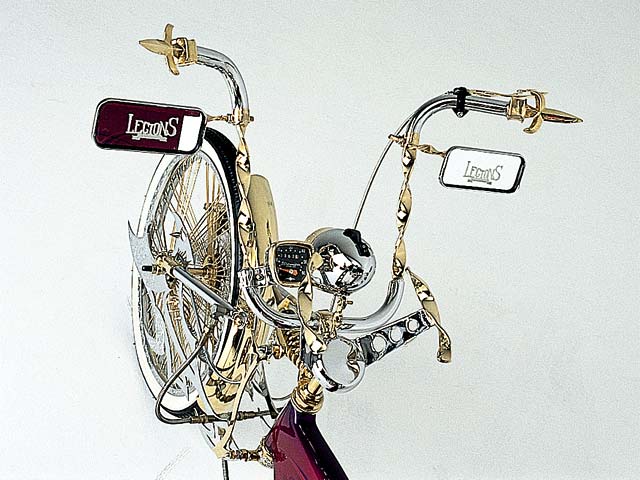 Once completed, the frame was taken to Poly's Kustoms in Modesto, California, where Poly plugged in and sealed the frame before applying a pearl white basecoat. Poly then proceeded to shoot the complete frame in House of Kolor candy magenta. The frame was then shipped to Allen's Signs in Salinas, California, who took on the pinstriping and airbrushing tasks. The frame and custom trunk were then buried in clearcoat and buffed out to leave it looking like glass. The trike was now ready to be assembled, but not before being loaded with custom-built parts. With rumors of a few top trikes gunning for the Trike of the Year title, Freddy and Felipe didn't hold back. The brothers found a set of disc brakes and bolted it onto the front wheel. For wheels, Felipe took a stock set apart and relaced them with a six-spoke pattern. The wheels were then mounted in hard to find 20x1.75 Cheng Shin tires. The forks were also replaced with a new set of plasma-cut custom arms, which were used to accommodate Pro Hopper bicycle cylinders. The rear original Schwinn basket was also modified with plasma-cut wings and a custom Z-rack.
