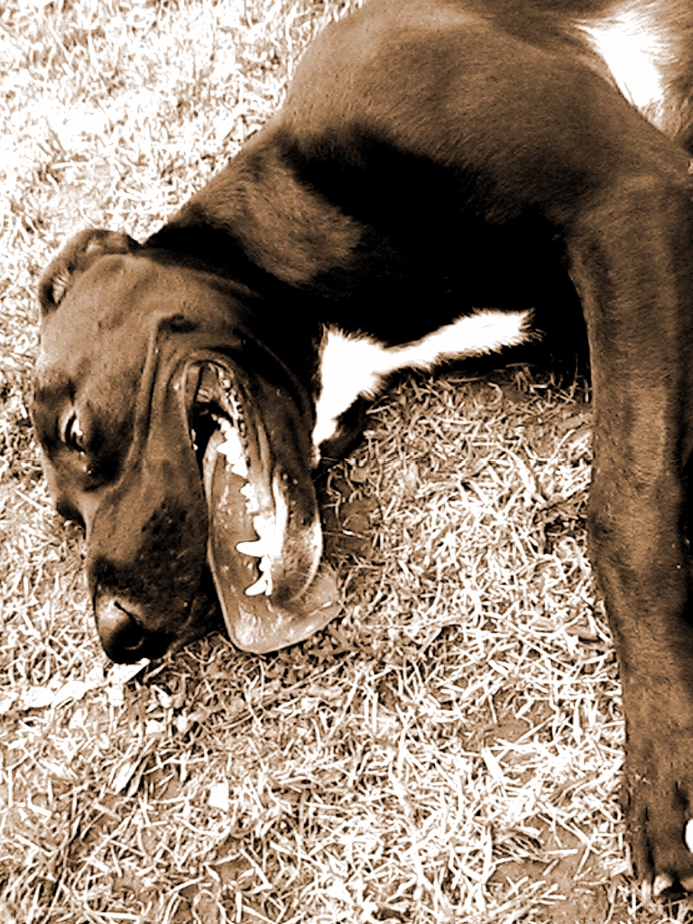 He looks like he's smiling or licking grass but he was just beat after a good old ball playing session. Yee haw.