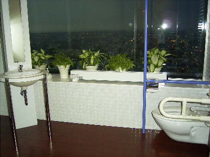 了 -- 至少由始至終並沒有任何職員前來阻止。可惜和老公約了七時等侯,看不到夜景。看過 Rurubu 的專題介紹別冊,臨走便映了這一張給傷殘人仕用的廁所照片;男廁就在隔鄰,也有一大片玻璃的,女廁那邊沒有的啦...