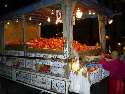 喝完啤酒後真是飽得想睡了。晚上漫步於沒有雪的札榥街道別有一番風味。途中看到這標榜賣青森蘋果的流動車檔子。可惜猜不透價錢牌上寫什麼,試過跟伯伯指手劃腳也不成功,好像一定要