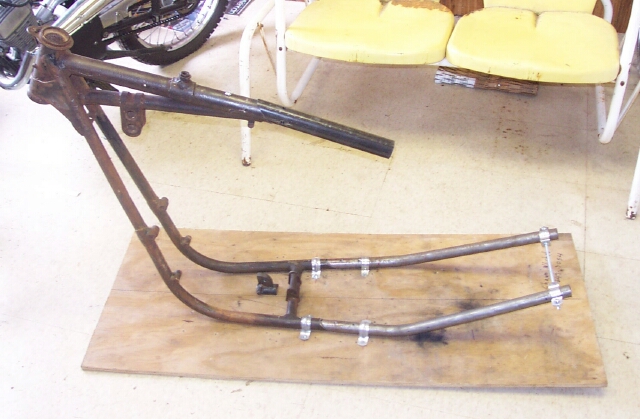 Frame is at the shop getting tigged,it's taking the welder a while to get to it because it's riding season and I'm not the kind of guy who bitches about a job that won't be finished for a year when others need help to go riding right now.I expect the frame to be all welded up soon and then there will be more fabricating,a new cross-member for the tranny and motor mounts and a single center post and of course the upperpart of the hardtail and axle plates.I couldn't bring myself to buy a hardtail for $200 when it's only $75 of D.O.M. so I bought the steel tubing from onlinemetals and went to a friend who had a Greenlee 555 bender (used for electrical conduit) and bent it myself.Another issue is I could not find a pre-fabbed hardtail made from 1-1/8 tubing. (the size of the tubing the frame is made of) Having a little trouble getting the motor ('62 Super Rocket A-10) apart as it lay on the floor of a barn for 20-odd years but working on it.