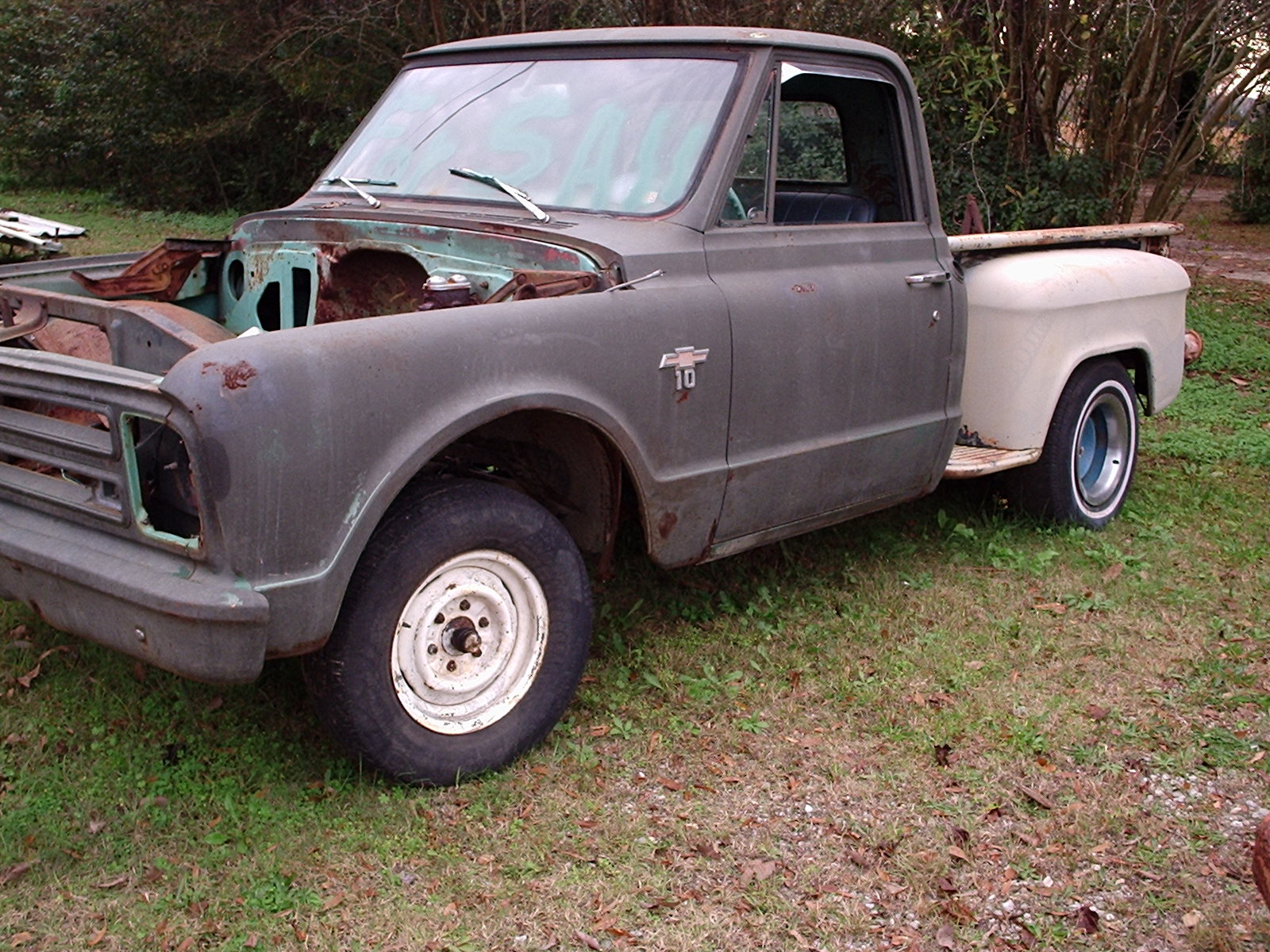 For sale 1967 C-10 NO motor or transmission (the owner says he may have one lying around). He DOES have the hood, but I did not see it. I just saw this truck and wanted to pass the info on. I have no desire to make anything off the deal, just thought someone might want a project. You deal with the owner and leave me out of it!!! The truck is in Eutawville ,SC About 12 miles East of the Santee, SC exit (exit 98) He is old and has Parkensions Disease. His phone number is 803-492-7762. Sorry, I do not recall his name.