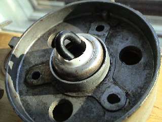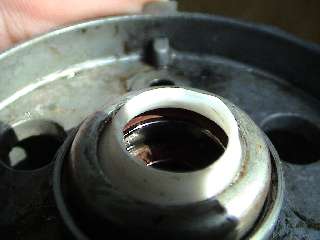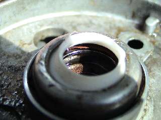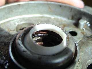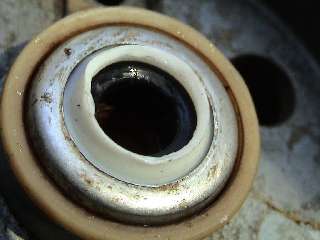 The Leak Fix - Step 2 Get rid of the seal "innards" using a mini screwdriver. For some reason disassembling the spindle assembly seemed somewhat difficult. I can't quite remember those details several years prior. 3 photos to the right are the "after" shot. Note how the inside of the seal chamber is somewhat void of any rubberized components. Leave the white teflon like thing undamaged. Sorry, the photo was tough to get. |