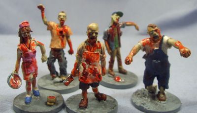Whenever an human is killed, EVERY zombie within 2" of them must test to see if they resist their hunger for brains! Roll a D6 for each zombie. On a 5+ they are unaffected. On a 1-4, that zombie must remain where it is feasting on the remains. Feeding takes one turn when zombies outnumber the dead by six to one. Anything less than six to one takes two turns. During that time, feeding zombies may not move or initiate combat. Any zombie attacked while it feasts will fight normally.