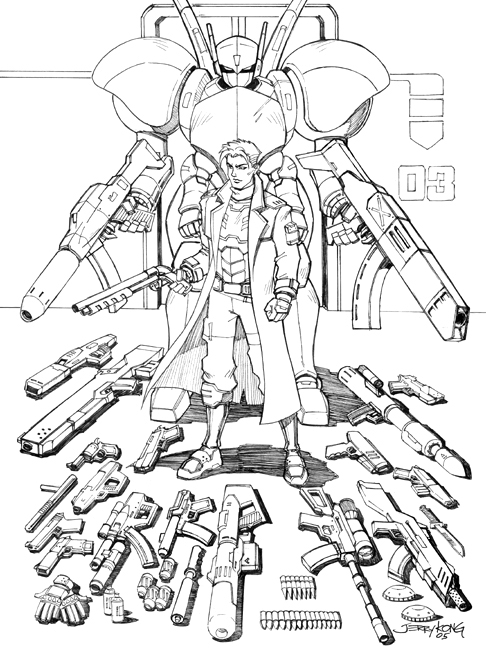 This illustration was done for the the game company Tremorworks LLC . Depicted here are the various weapons (including the combat suit in the back) that can be used in the RPG game Perfect Horizon. The visual designs of some of the weapons were by me, some of the others were by the game's designer, Sean Boyle, and some were a collaboration between the both of us.