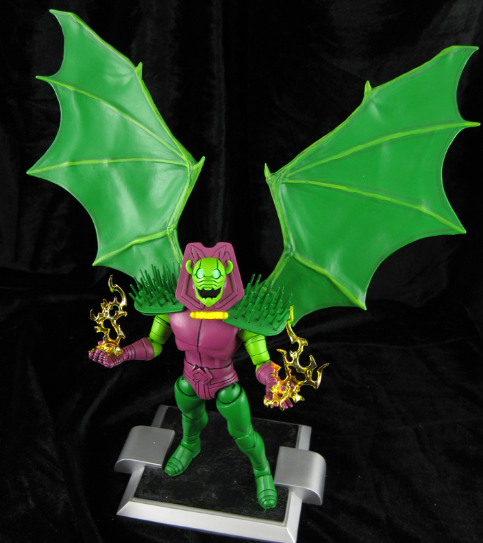 Annihilus shall spell your doom! This cosmic winged terror has plagued the Fantastic Four ever since they swiped his Cosmic Control Rod way back when and now he's meaner than ever. This Marvel Legends classic version of Annihilus was made from a Marvel Select Ultron base body with Dr Doom hands. The head/jaw is Ultron as well with Aves Apoxie Sculpt detail added. Modded Percy Jackson Hades' wings and a scratch made collar/shoulder pad/spines completed his look. He stands seven and a half inches tall and has a wingspan of 15 inches, the wings on double ball joints and able to move in any position. Annihilus' eyes and control rod are clear with reflective backing so they shine brightly when light hits them for a really neat effect. Cosmic energy effects came from the ever useful back flames of a White Lantern Flash painted with Tamiya clear yellow.