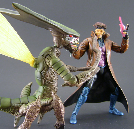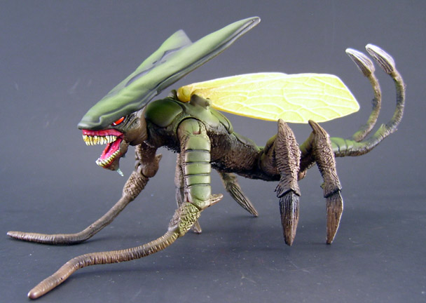 It's those alien sleazoids the Brood! Remember my old Brood? Well I really, REALLY needed to do a new one. Here I used the same Gnarsh Alien Racers body but swapped out the head for the old 5" Brood head which I retooled and resculpted a good inch and 1/2 more head-crest behind it. Apoxie sculpted bug-armor sections were added too. I added the Wasp's wings attached with Xevoz ball-joints (used for the neck as well) and airbrushed him with a mix of browns, greens, and blacks. The front tendrils are bendy tendrils from the old Venom Phage figure. He has DROOL! I took some clear epoxy and mixed a touch of clear green paint in it, then played with the mix until it began to harden, stringing it down on the jaw in several places. Looks gooey and wet, heh!