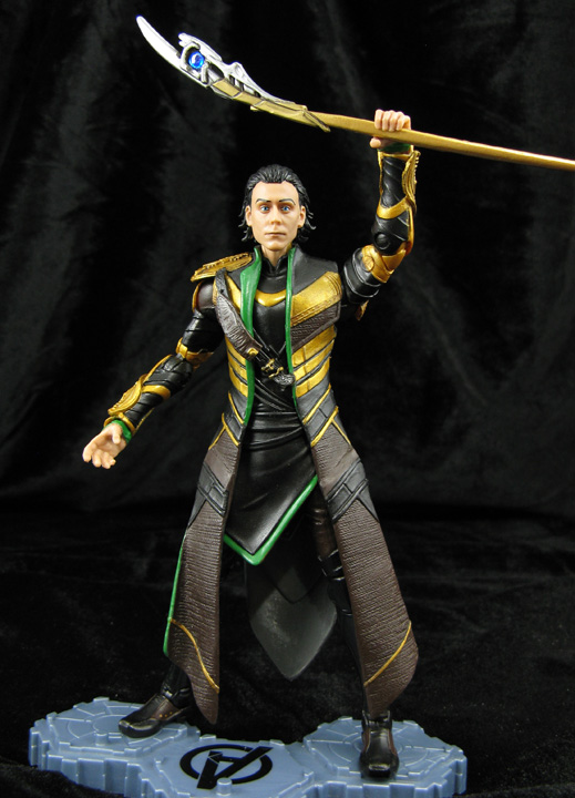 You knew it was coming. Loki just wasn't complete without them. While the Avengers Walmart exclusive Loki was great he was still missing the most important thing Tom Hiddleston brought to the character...wispy hair tips. Here I've revamped Loki to be more screen-accurate by resculpting his iconic movie hairstyling using Aves Fixit Sculpt. A single right shoulder pad was added as was his casual look but putting on the cape adds the second shoulder pad to complete the 'King Loki' image. His tunic was also lengthened, armor added to his forearms and a chest strap. Since the helmet would no longer fit I added a second helmeted head and gave his armor a brilliant gold finish with antiquing. A complete paint job in the proper black/brown/green colors made his details pop. Loki's staff was lengthened and a clear blue Mind Gem added. Now that's the Loki I remember seeing on the big screen!