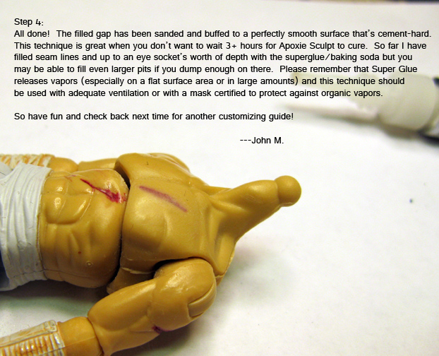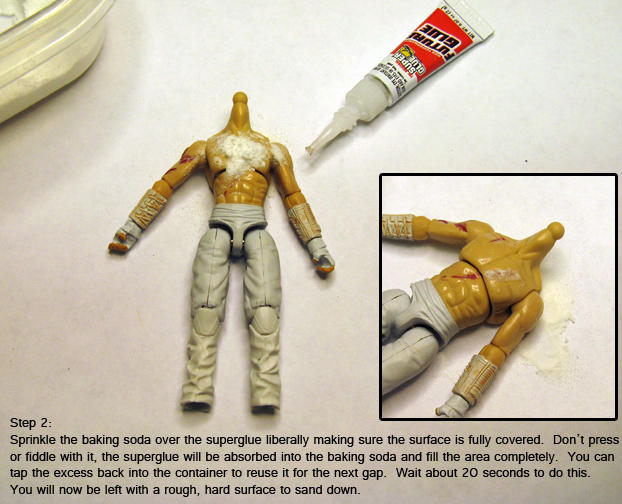 Welcome to another one of my custom action figure tutorials. This week I'll show you how to fill gaps in your custom figure in under a minute using Super Glue and Baking Soda. It's quick, easy, and most importantly extremely durable! All you need is any brand of liquid Super Glue (I like Future Glue from the Super Glue Corp) some baking soda, (talcum powder also works) and sandpaper.