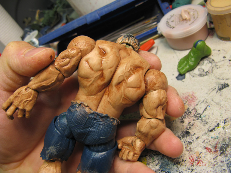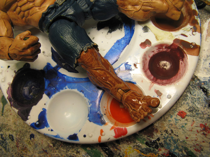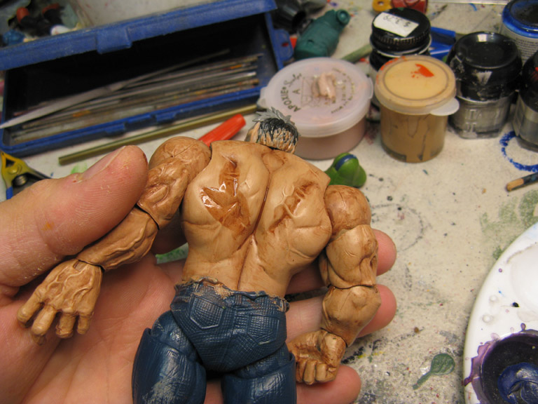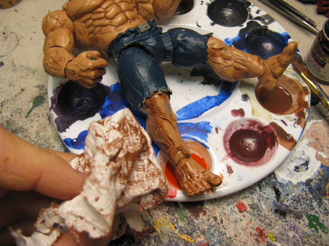 The Paint Wipe technique is a great way of shading your figure while giving it a realistic tone. Here I'll show you the basics of the Paint Wash and how to apply it to your custom. Keep in mind this is only a guide and just outlines the steps and techniques I use. Your results may be different depending on the paints/tools you use and your level of skill. Study these steps and practice until you achieve the result you’re looking for. If you're new to painting I suggest you first check out my Basic Figure Painting Guide before you start an advanced technique like this. This Splatterhouse Rick custom's paint wipe is almost done. You can see the difference between the right leg and the rest of the body? The basecoat is a basic flesh color and the paint wipe is a brick red. Once applied the paint wipe will darken his flesh tone and bring out the detail of the muscles STEP 1: