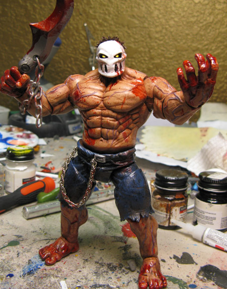 Once the paint wipe is dry you can lightly drybrush the original base color over the section. This helps blend the tones together and you can even add highlights at this point. Here's the finished figure of Rick from Splatterhouse. After all the other details and effects are added, the whole figure comes together. Looking for other custom action figures made by awesome customizers around the world? Click your favorite series below to be taken to this week's offerings!