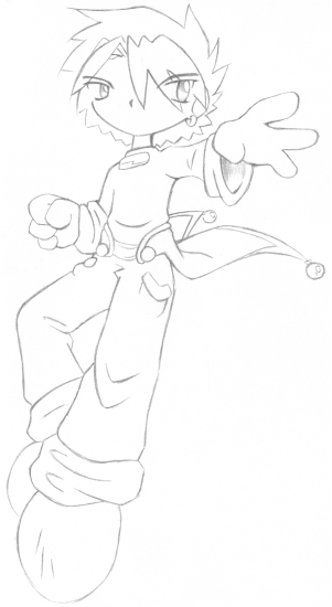 This is Shard, another of the hero's possible friends. He is percieved as being a pessimist, but he also has a strong sense of justice. Shard's familiar is a cute fluffy bunny-looking thing, which angers him because he doesn't consider himself a cute fluffy bunny-looking thing kind of guy.