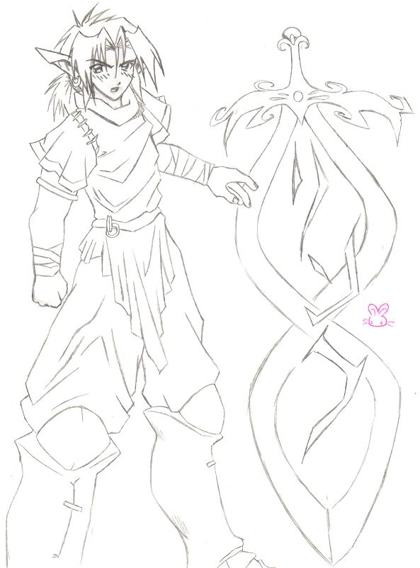 This is the last one, I swear! Anywho, Link in a Spark pose, with the Fierce Deity's Double Helix Blade in the background for some reason. I've only drawn the Double Helix Blade once (in a pic I've yet to get scanned, but we'll see it once I get to my favorite sketchbook!), and I had to make up the hilt for it here. Whoa-hey! Fingernails?! When have I ever drawn fingernails?!