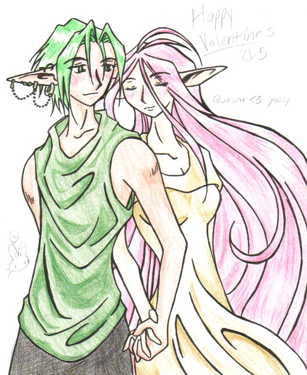 The adorable couple, Quasar and Yossy. This, obviously, was created for Valentine's day. This is actually a poor depiction of Quasar... he's supposed to be the overenergetic, funny one. His earrings are cool.