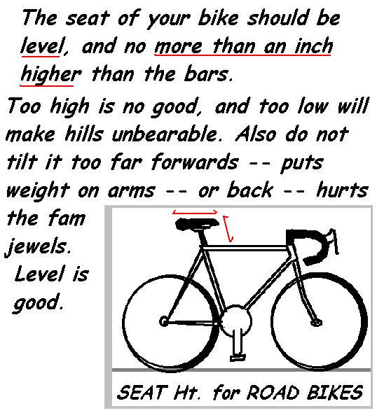 On road bikes, your seat should either be level with the handlebar, or an inch or so higher. Do not make it too high! Your seat top should also be level. Tilted forwards, it causes you to make an effort not to slide to the front of the seat, distractign you from pedaling and putting wieght on your arms, shoulders, and wrists. Tilted too far back, the nose of the saddle pokes up into the nether regions, which is no fun either.