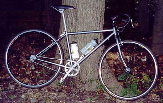 WHY THIS BIKE? The idea behind this bike is to have a good-handling fixie with cantis for hilly descents and bad weather/bad traffic braking. (Plus, cantilever brakes on a road bike look cool and allow clearance for wider tires in the winter or for mild offroading!) I first used inverted cruiser bars and both brakes, but quickly went to cowhorns and front brake only. I put on road drops and both brakes for the 5 boro ride through NYC, because even tho a rear brake isn't used a lot on a fix I had never ridden with 30,000 people so i wanted to be careful! Shortly thereafter I made improvements; a slightly longer seatpost got better leg extension, different brakes outa the parts box helped the front, and I removed the rear brakes and lever. And after the front wheel went on me I replaced it and the handlebar. Thus I set it up in it's current configuration. The small frame, about the lower limit of my size range, actually handles well although it looks tiny; the sloping top tube and overall smaller size give more clearance during dismounts on hills and whilst moving about on the bike in traffic and it's stiffer and lighter at least whilst riding. The dual water bottle mounts are a plus, as most older bicycles are lucky to have one. With the capability for carrying a rack and even mounting fenders (or at least it had this last until I filled in the brake hole in the back -- I can still mount a rack though, and clipon felders remain a viable option) this could be a great long-haul bike -- in fact when I first got it I intended to turn it into a touring bike, but the frame was too small to work with the parts I had. The fixed configuration is perfect, however. Plus, it doesn't look like much so the theft risk is lower... ;)