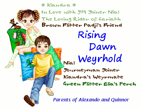 Rising Dawn Weyr did accept Kiandra and Nial, and the next day Kiandra, Nial and Jessilee all left for the Weyr. Kiandra hadn't been there long before she was Searched, and her first time standing Impressed a green named Cariath on November 26th, 2004. Nial doesn't mind that his love is now a dragon rider even though he will not be Searched and will never become a dragonrider. He knows that her heart is big enough for both Cariath and himself.