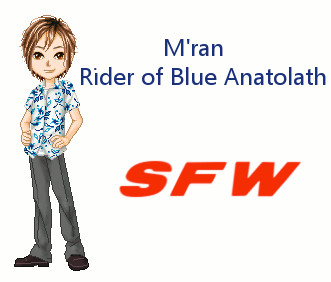 And here we have M’ran, my bluerider NPC. M’ran was another spinoff character from my brownrider A’drov, a nephew who is only two Turns younger. He is the son of Dranela, A’drov’s oldest sister. Dranela is a bit of a martinet, who needs to know exactly what is going on at all times and has to be in control, but M'ran is a happy go lucky fellow who allows life to flow around him without really getting bothered by much of anything. He can be a bit of a chatterbox when he is excited, and likes the ladies, although he has trouble committing himself to any one woman. This particular attitude drives his mother crazy, which may be part of the reason he is the way he is. When you feel like you are over-controlled all the time, it’s natural to want to break out and rebel in some way. M’ran stood three times before he finally managed to Impress his blue Anatolath, who actually ended up on top of him at their Impression. M’ran was very happy about this, because this was his last chance to Impress at all, as he was now 24, and that is the cutoff age for standing. That was the only Hatching that he was actually nervous at, because he knew that if he didn’t Impress, he’d end up without a lifemate forever, and he didn’t want people to think him a failure.